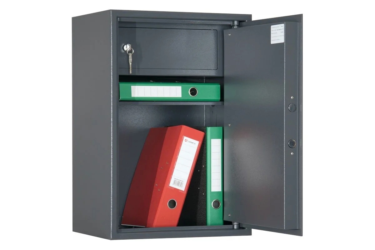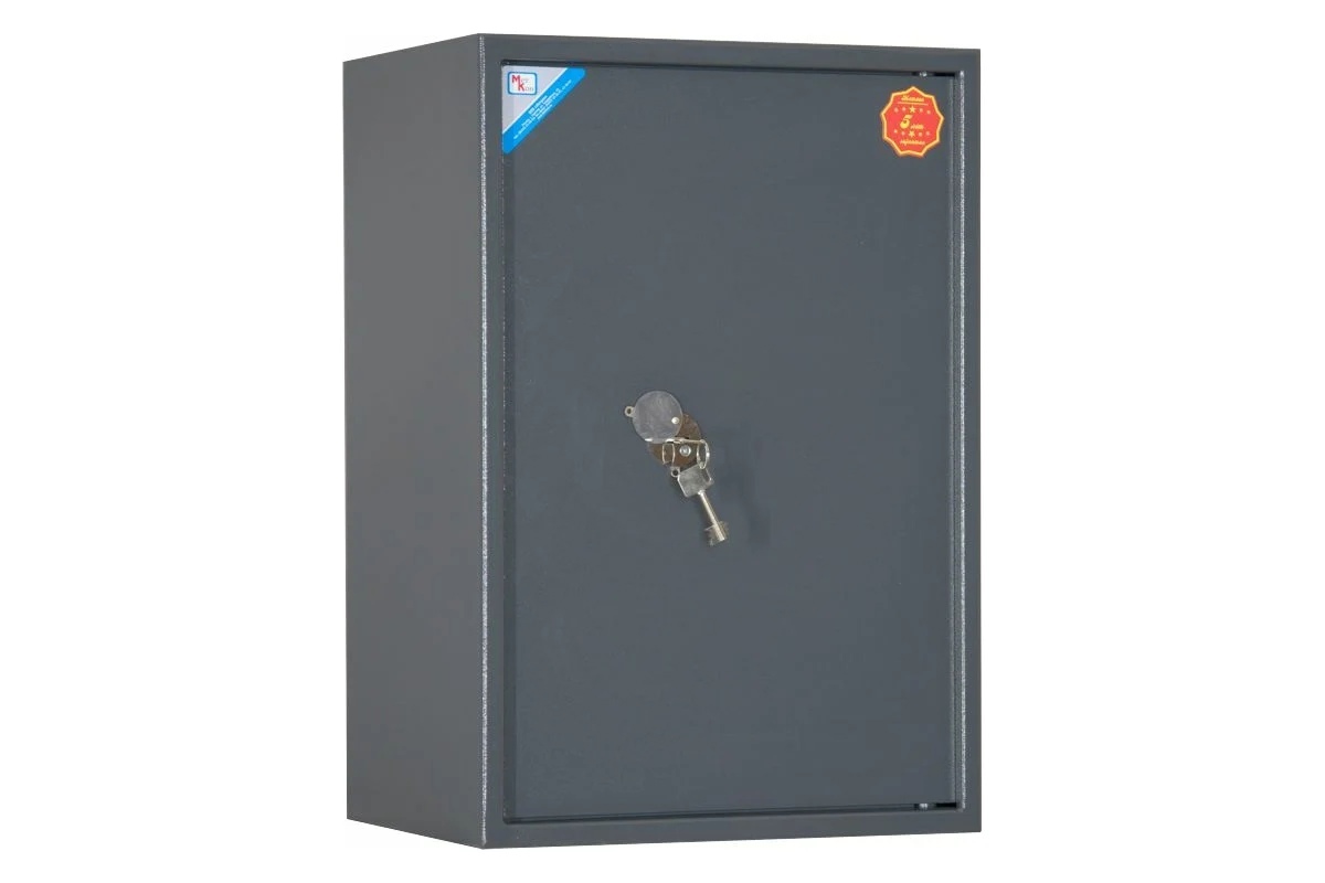 Сейф односекционный, оснащен одной съемной полкой и трейзером. В двери установлен ключевой сувальдный замок "Border", класс А. Диаметр ригеля 24 мм. Цвет: Серый с эффектом молотковой эмали.