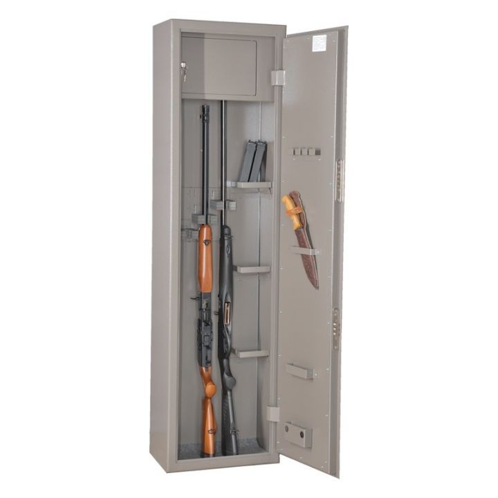 Отделение под патроны, запираемое на замок, имеет поднутрение, позволяющее ставить ружья на всю высоту. Съемные полки позволяют разместить необходимую амуницию или в дальнейшем увеличить количество хранимых ружей. На дне коврик под приклады. Ложементы под цевье выполнены в виде немецких роликовых зажимов, что позволяет четко фиксировать ружья в разных положениях. Особенно с оптическим прицелом. Корпус и дверь выполнены из стали 3 мм. Дверь коробчатая, усилена фальшпанелью. На двери расположены элементы для шомполов и масленок. Два сувальдных замка "Просам" повышенной секретности. Покраска полимерная-серая шагрень. Сейфы удовлетворяют всем требованиям, предъявляемым МВД к хранению оружия.