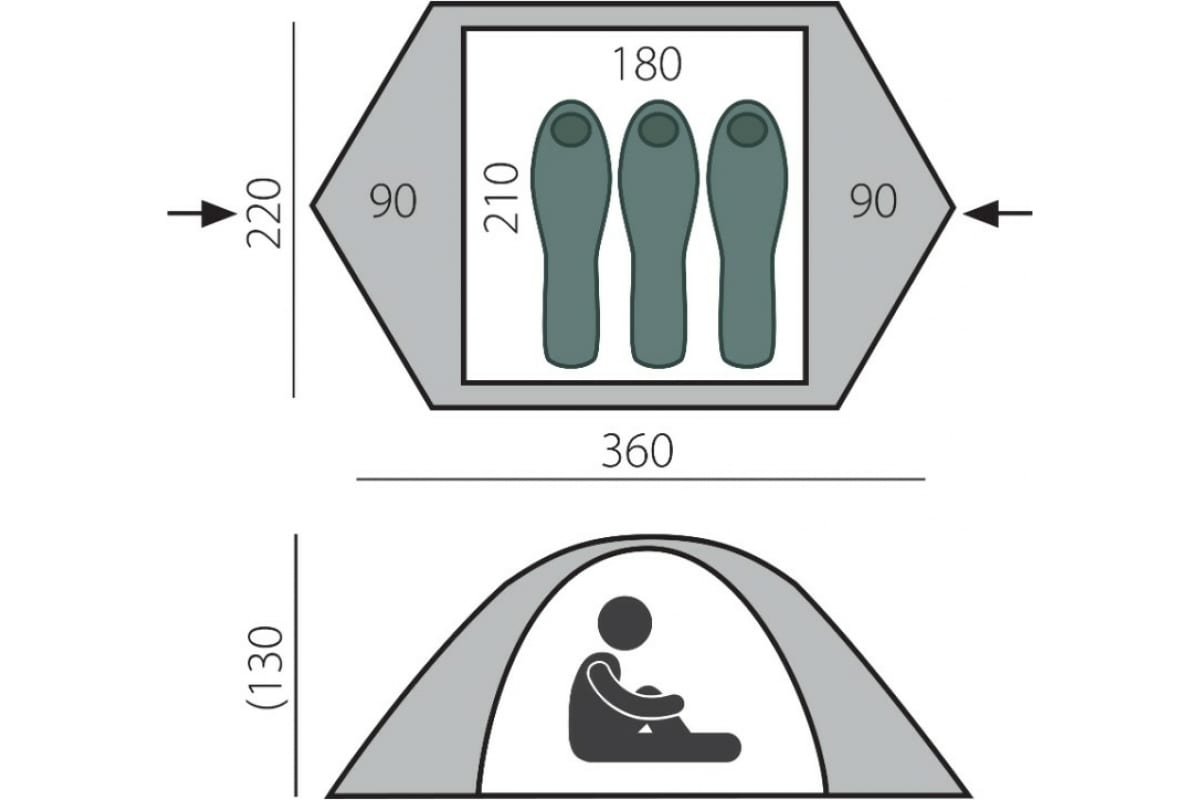 Тент палатки изготовлен из полиэстера с огнеупорной пропиткой. Устойчив к ультрафиолетовому излучению. Водоупорность составляет 6000 мм водяного столба.