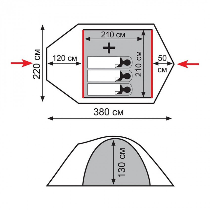 - Размеры внутренней палатки: 210х210х130 см