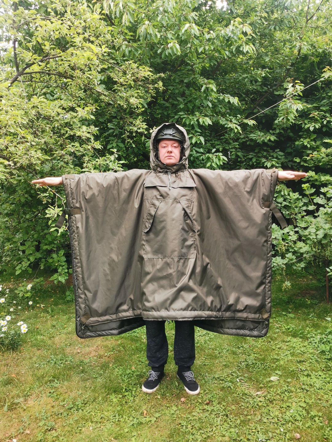 В качестве подкладки в пончо используется облегчённая мембрана с TPU 1000/1000. Она также обладает ветро- и влагозащитными свойствами.