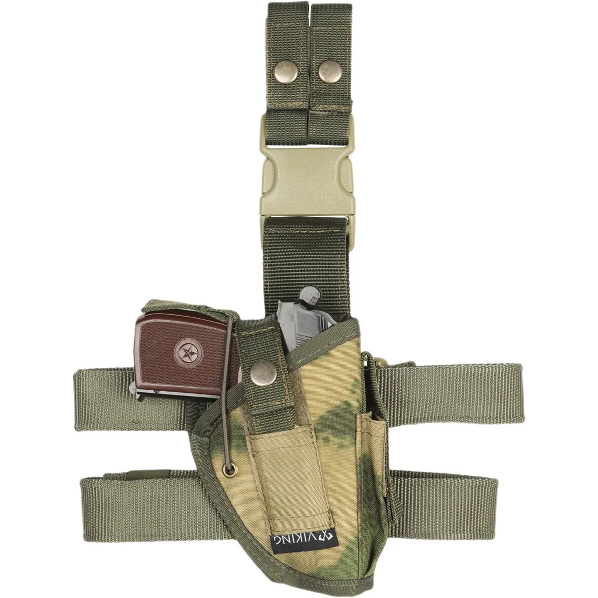 Сверху кобура крепится к брючному ремню или ячейкам MOLLE на тактическом поясе. Вокруг бедра застегиваются два ремня с прорезиненной внутренней поверхностью, за счет которой кобура надежно позиционируется на ноге.