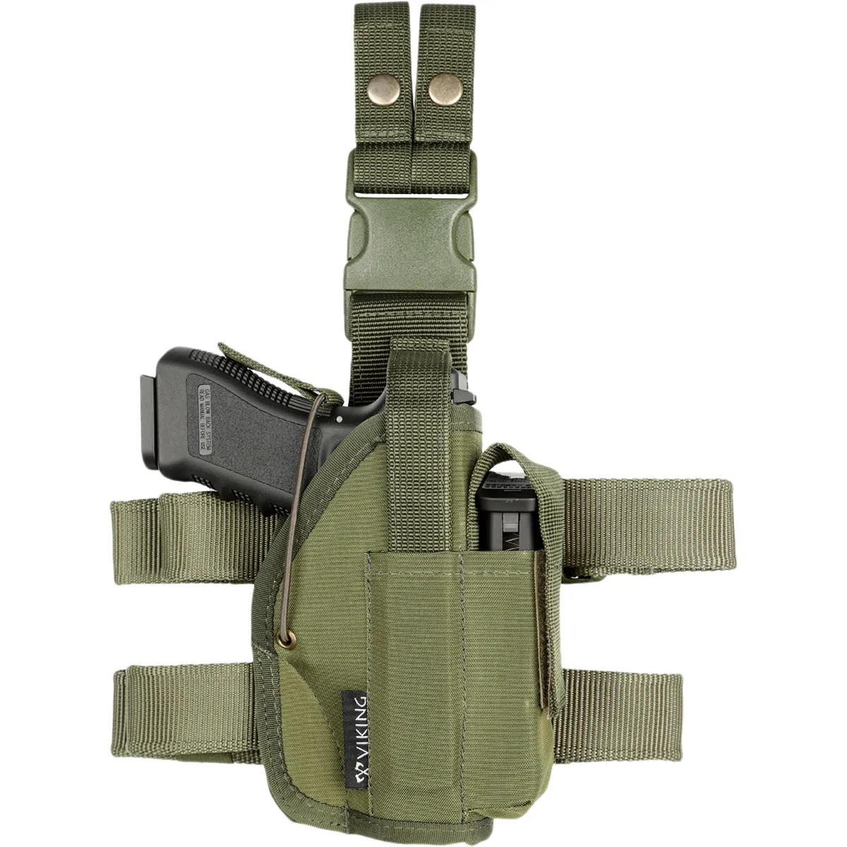 - Набедренное крепление пришито к корпусу кобуры и является несъемным. В верхней части кобура крепится к брючному ремню шириной до 50 мм, либо к ячейкам MOLLE. Вокруг бедра крепится двумя ремнями. Длина всех ремней настраивается.