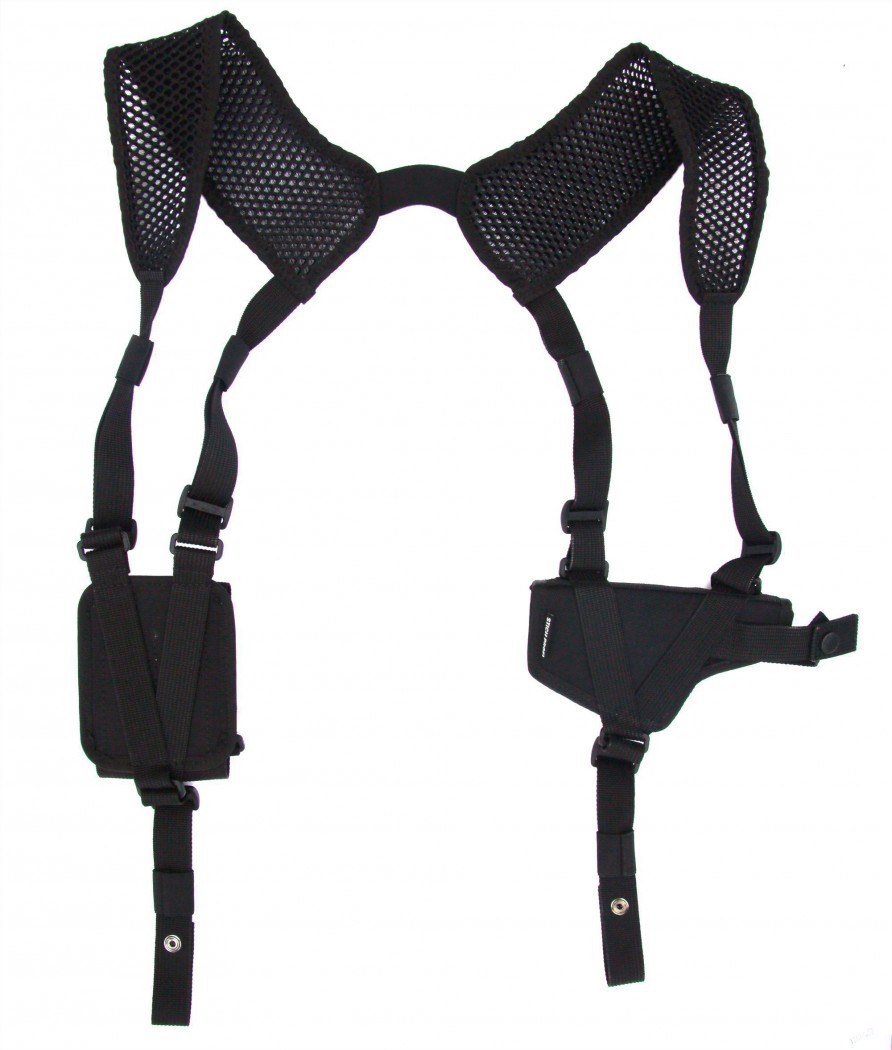 Наплечная оперативная текстильная кобура для пистолета с горизонтальным размещением оружия и подсумком под 2 запасных магазина.