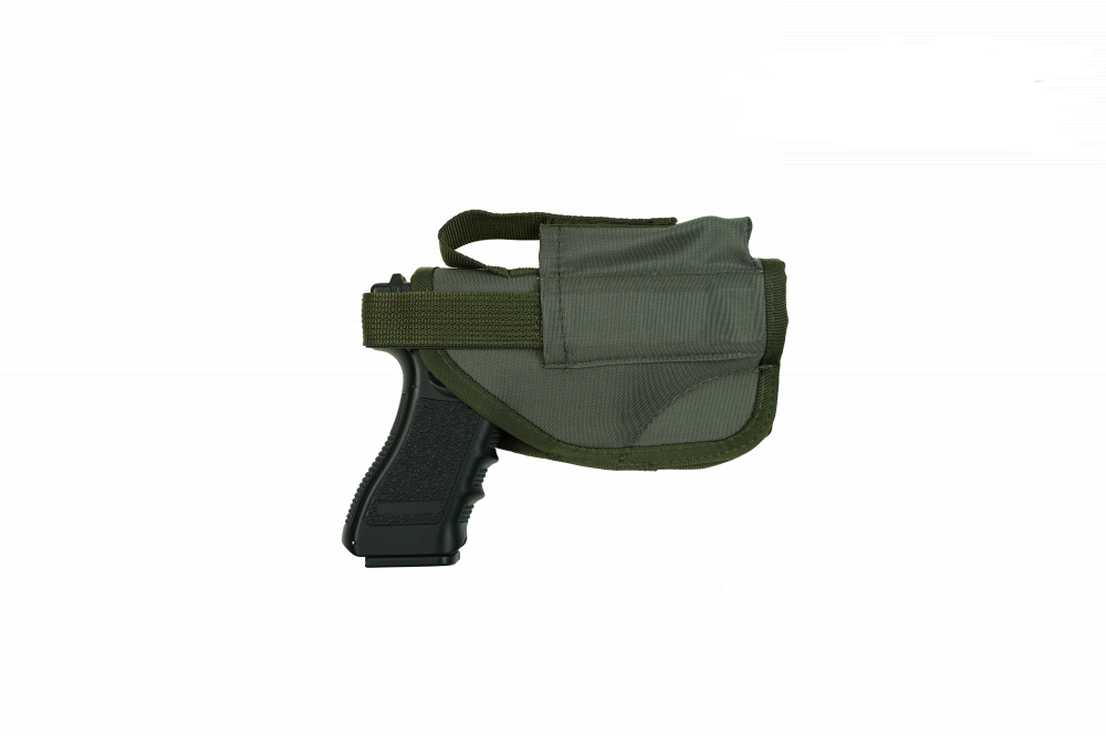 Пистолет фиксируется в кобуре за заднюю часть при помощи хлястика с кнопкой. Хлястик имеет жёсткую пластиковую вставку для быстрого открытия кнопки. Длина хлястика регулируется в зависимости от используемой модели пистолета.