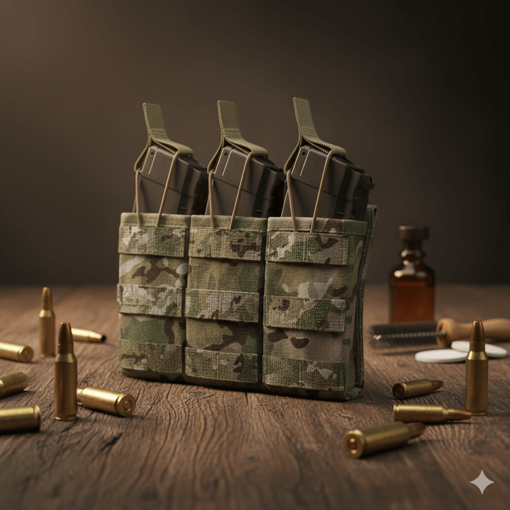 Магазин в подсумке фиксируется эластичным шнуром с флажком-фиксатором. Длина шнура может регулироваться в зависимости от габаритов магазина. На внешней стороне имеются стропы молле для размещения дополнительного подсумка для пистолетного магазина. Горловина подсумка усилена плотной стропой, благодаря чему она лучше держит форму. Это помогает быстрей вернуть отстрелянный магазин обратно в подсумок.