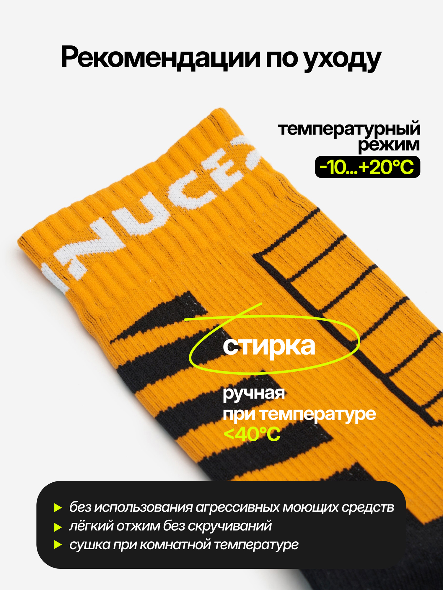 Внимание: для этих носков рекомендуется ручная стирка при температуре не выше 40 °C без использования агрессивных средств, легкий отжим без скручиваний, сушка при комнатной температуре.