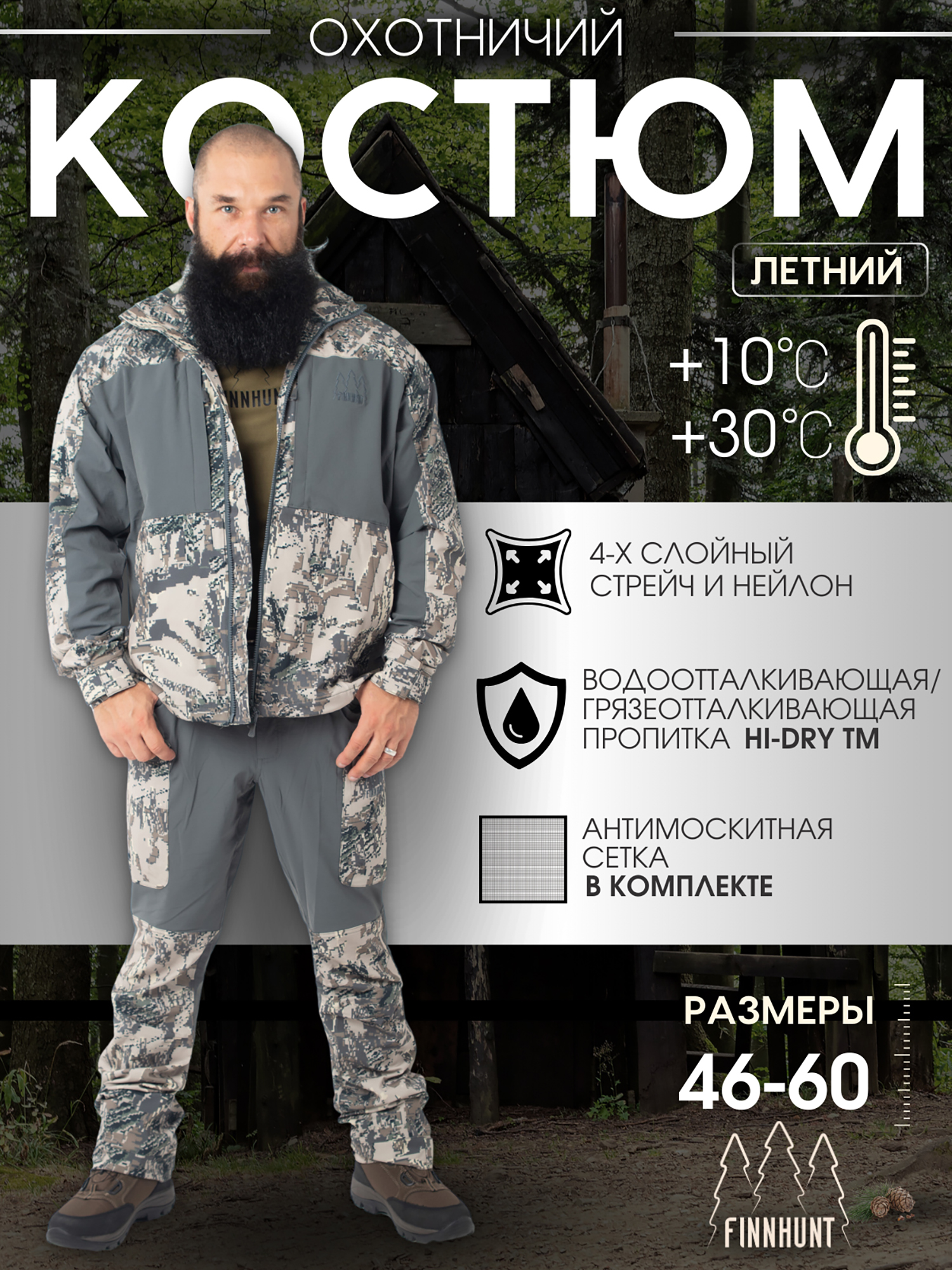 Охотничий костюм комбинирован из двух тканей: 4-х слойного стрейча и нейлона. Материал стрейч-части: 50% полиамид, 40% полиэстер, 10% спандекс; нейлон: 90% нейлон, 10% спандекс. Температурный диапазон от+10C до +30C.