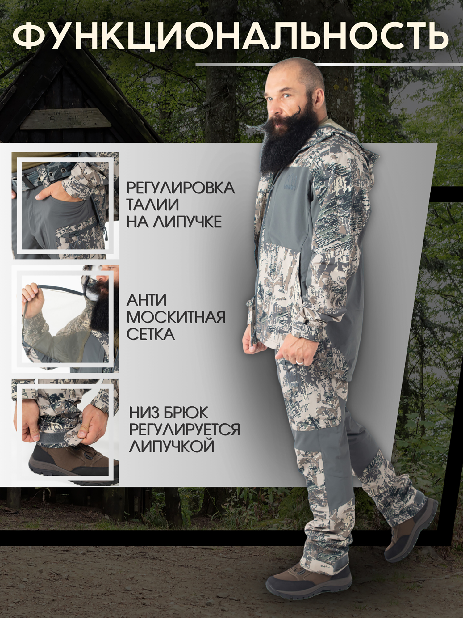 Эргономичный крой колен и качественная тянущаяся ткань обеспечат комфортную посадку по вашей фигуре. Дышащая технологичная ткань рыболовного костюма выводит излишки влаги и пота при активной носке, а регулируемый капюшон со съемной москитной сеткой защитит от солнца, насекомых и вредного воздействия ультрафиолета.