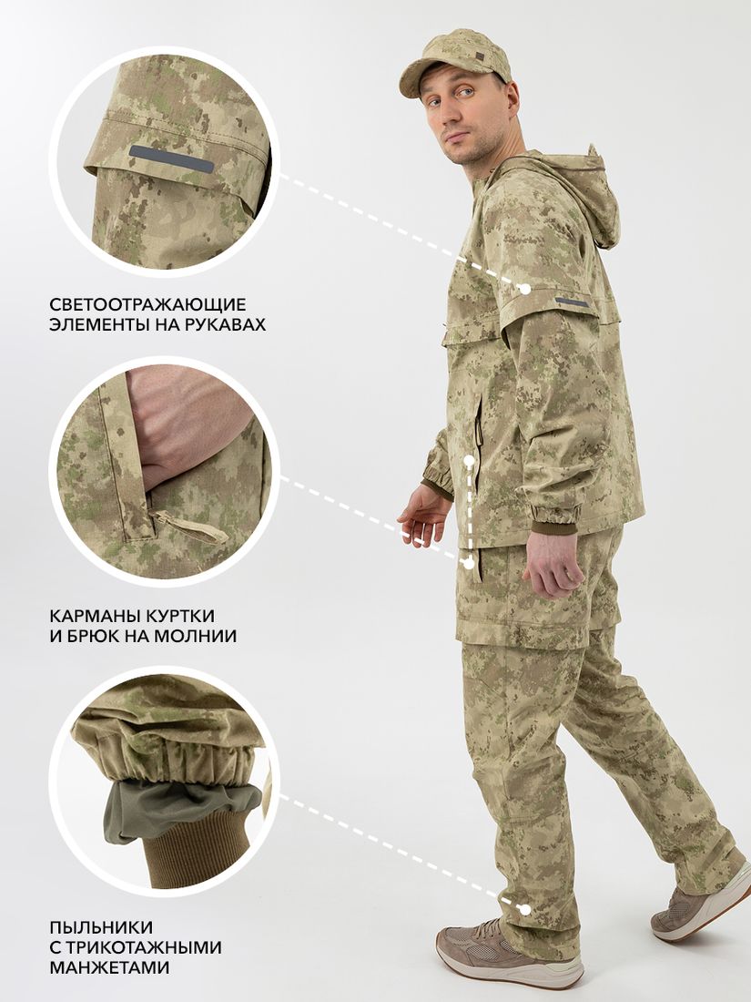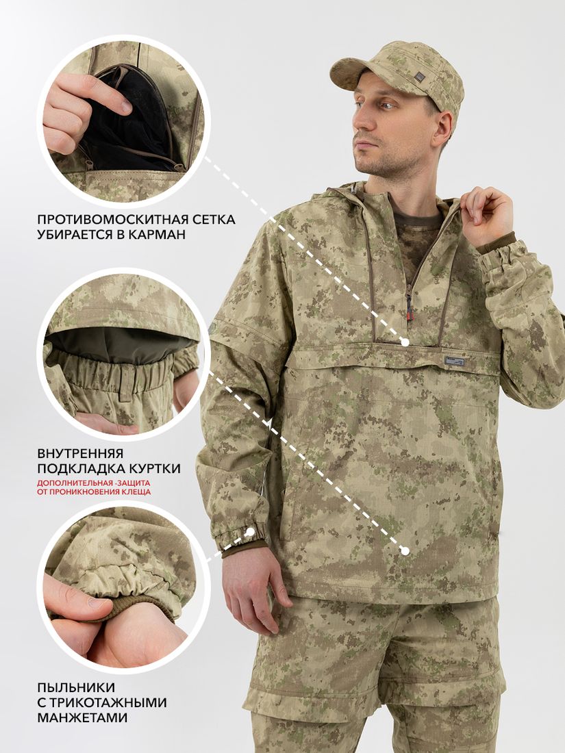 - Плотные трикотажные манжеты на брюках и рукавах не дадут насекомым пробраться внутрь.