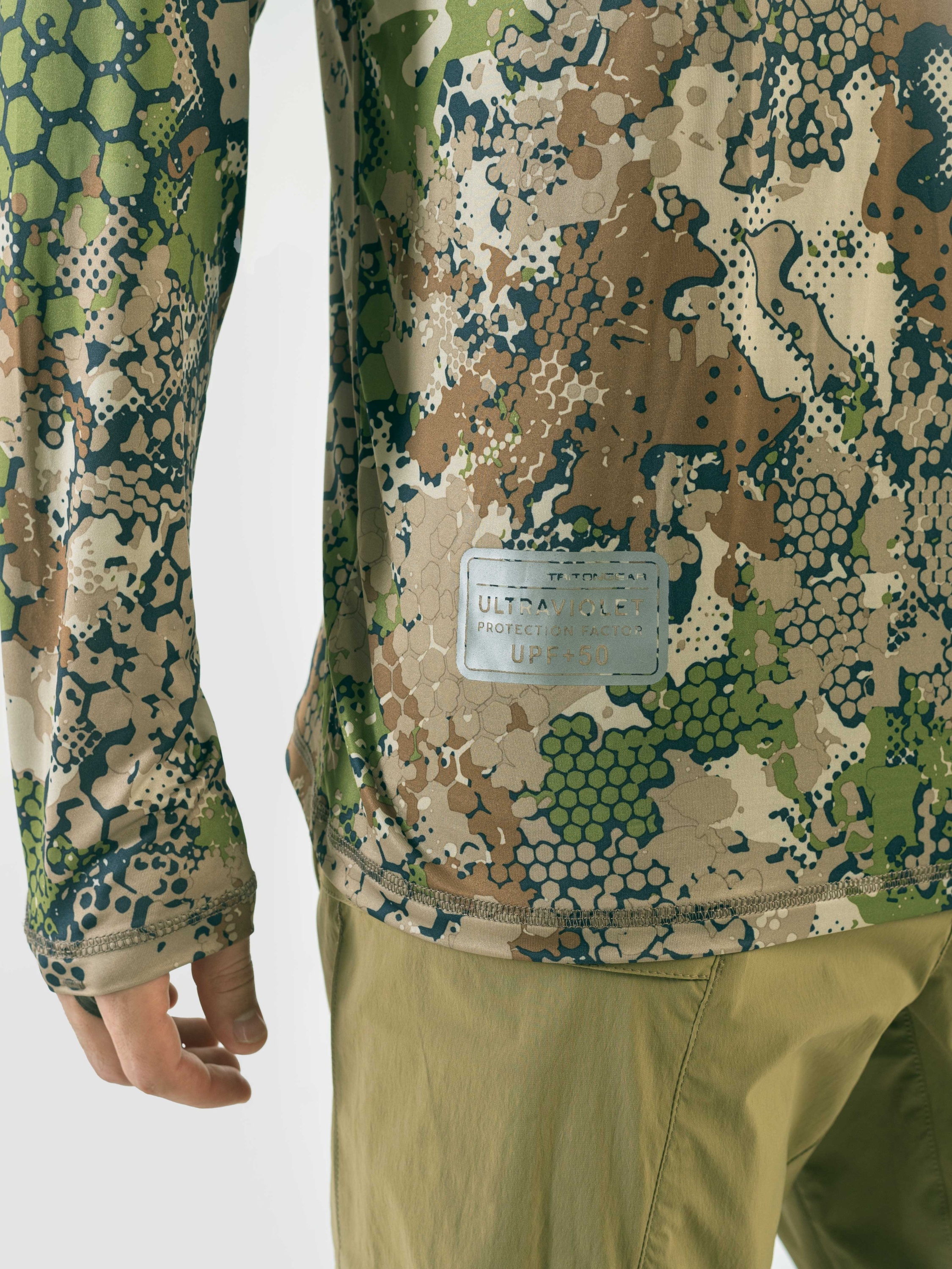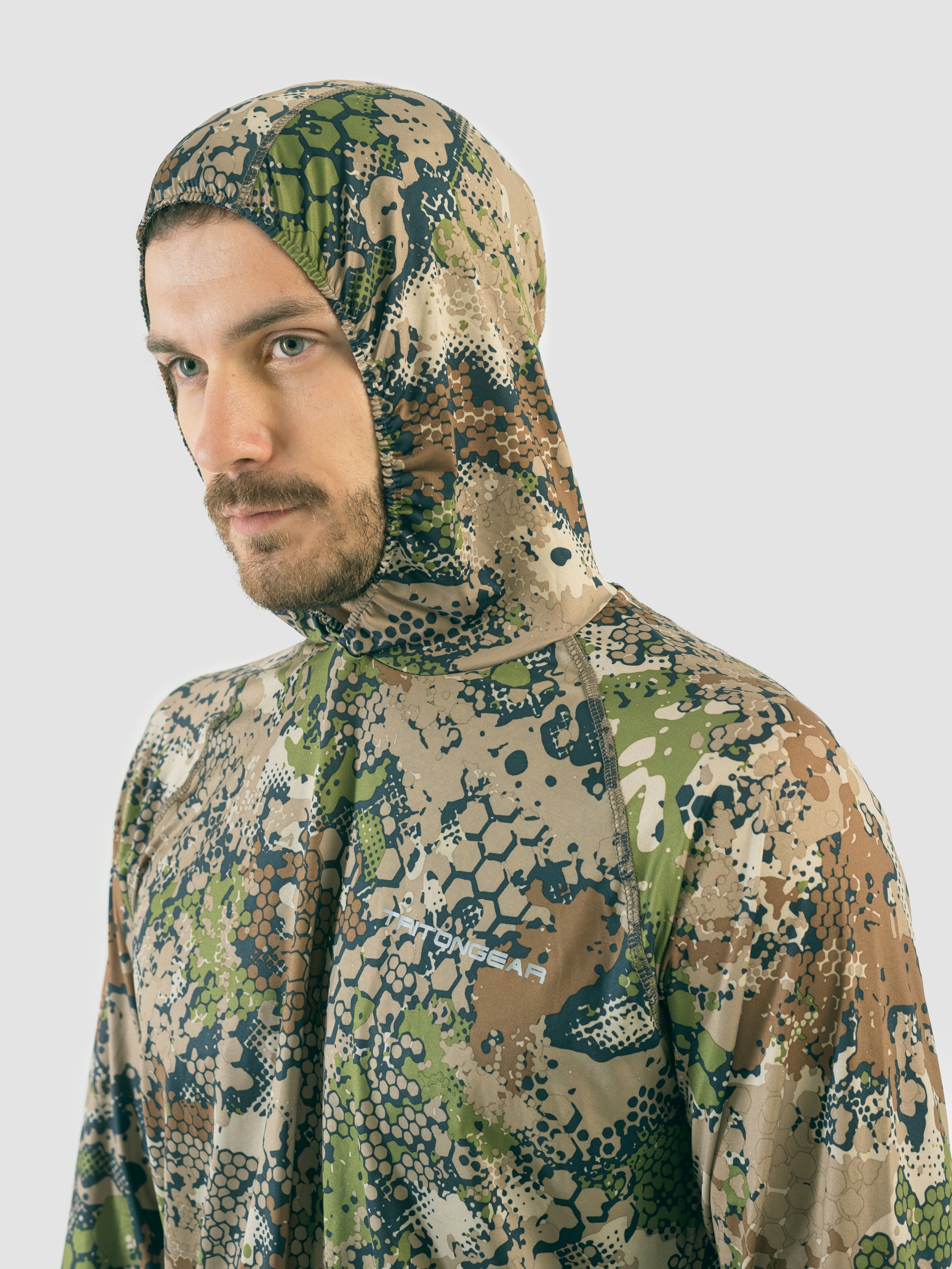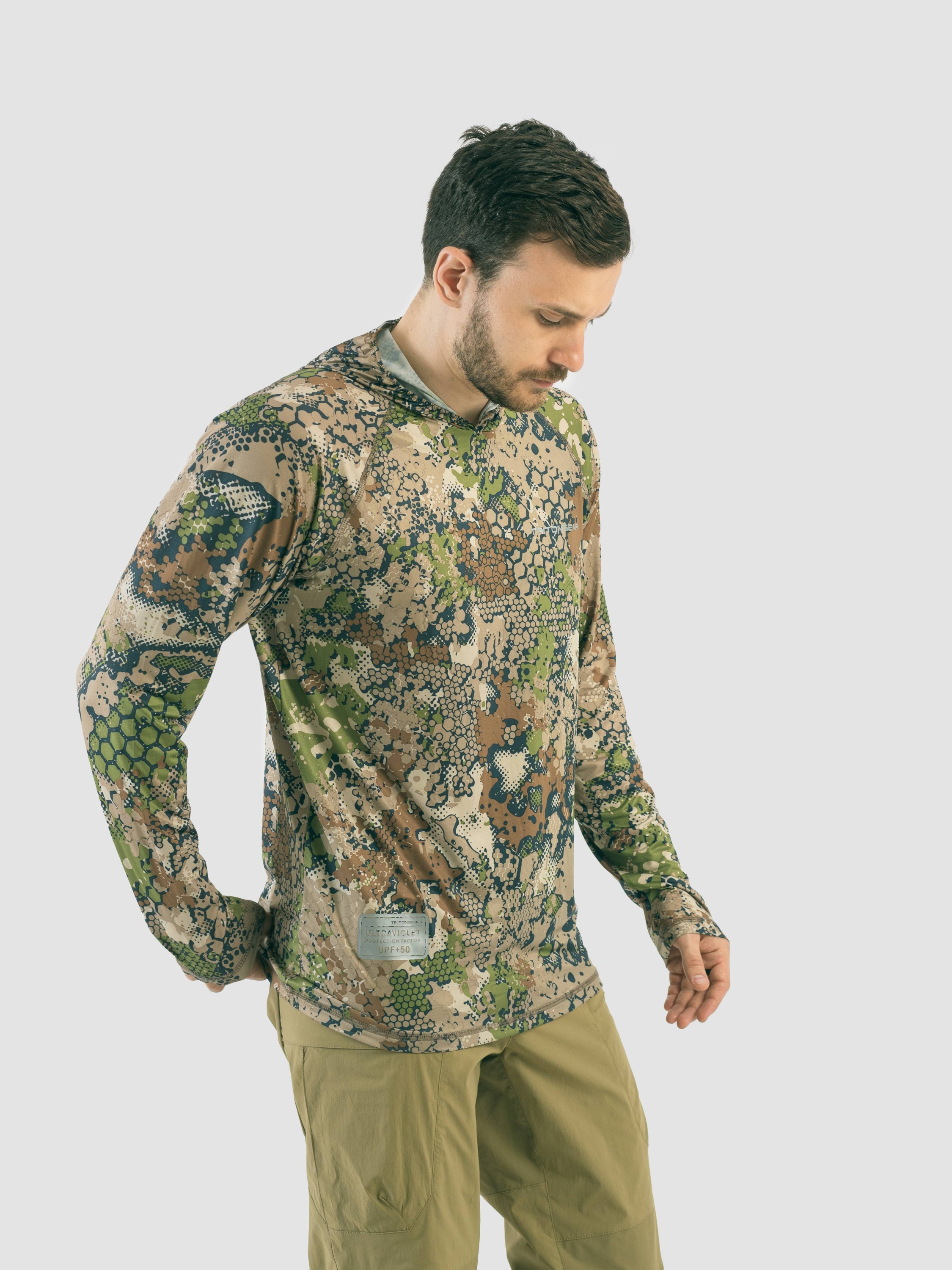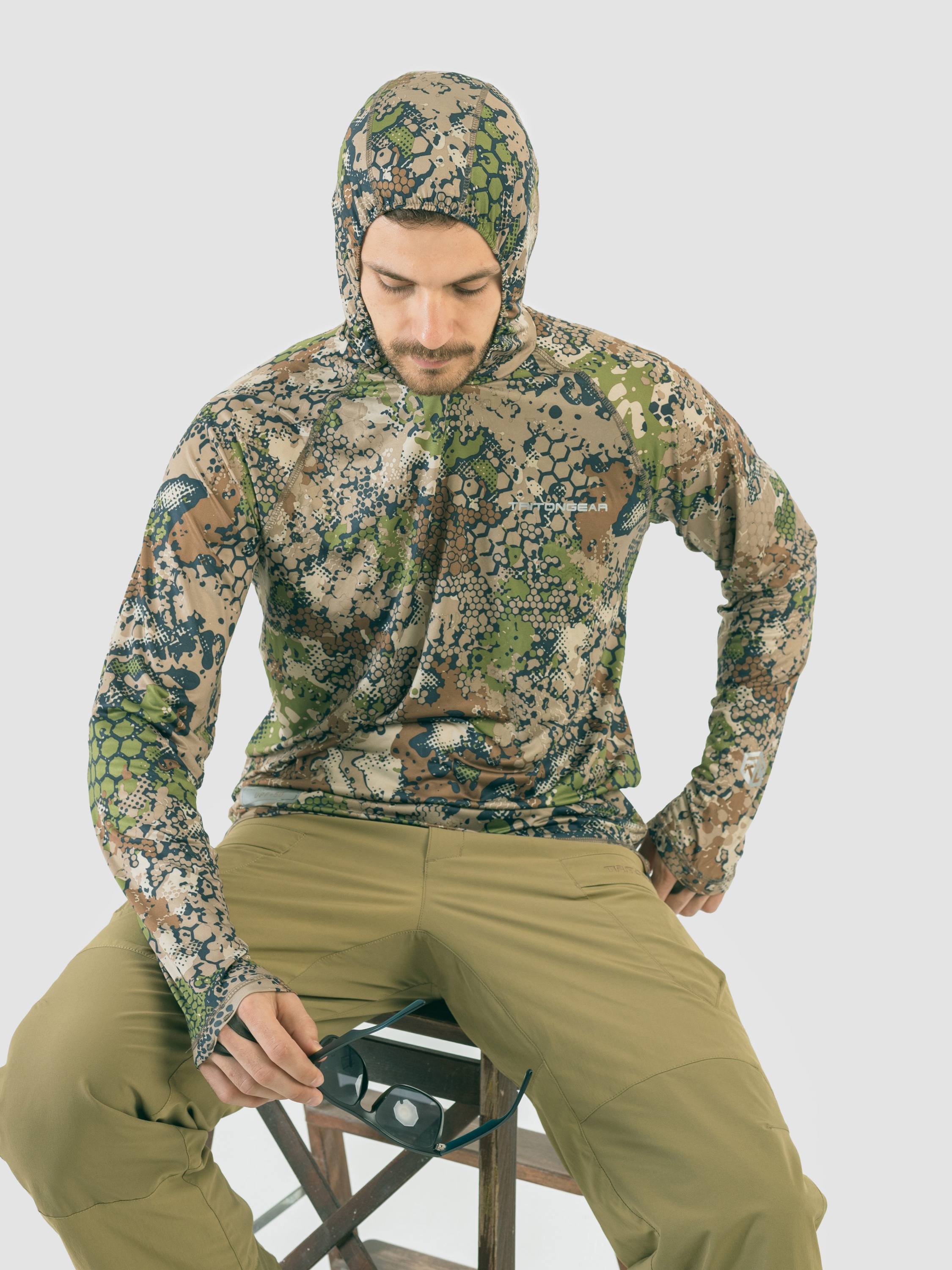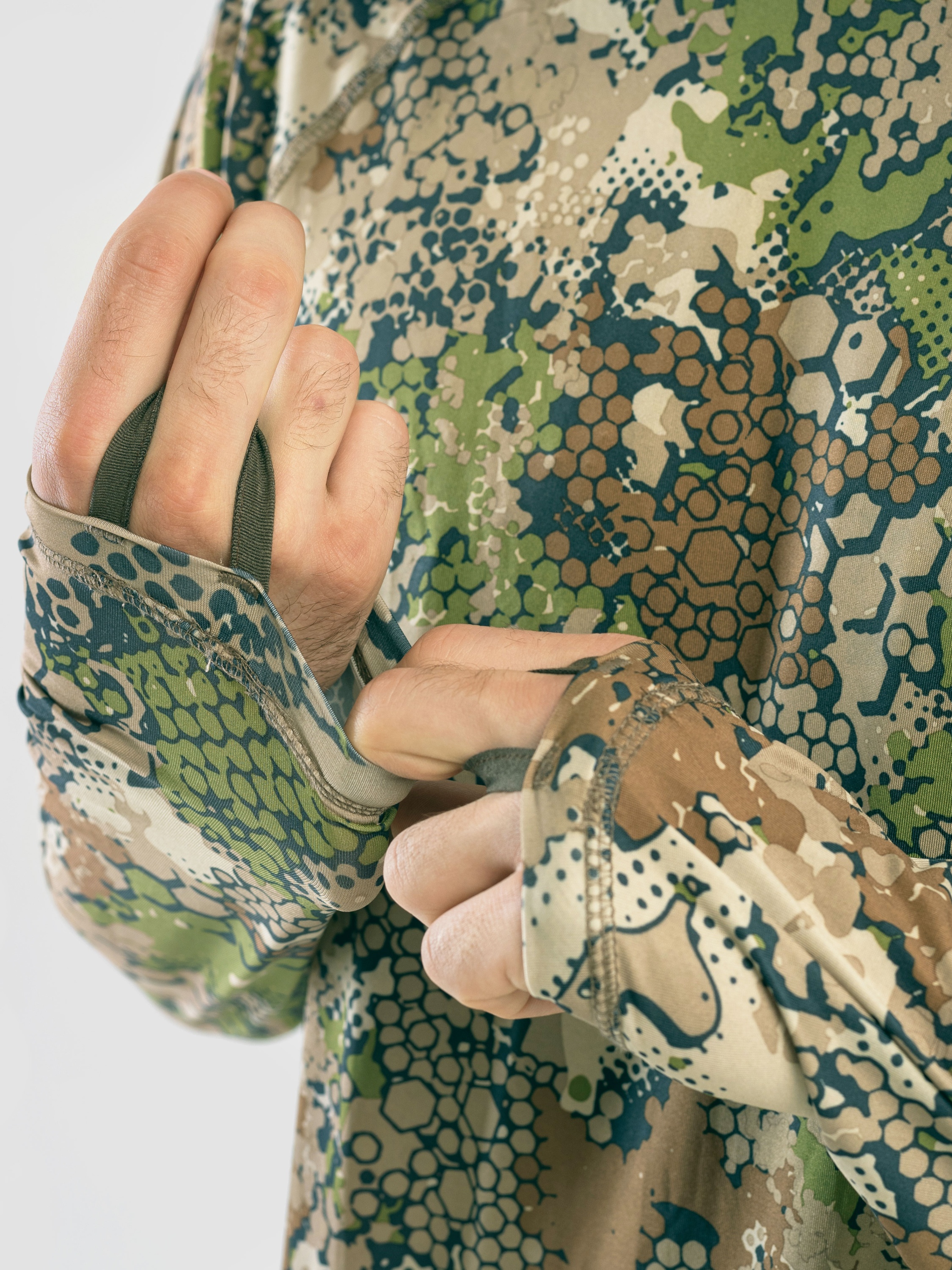 - Шлевка под средний палец — фиксирует рукава при активностях (рыбалка, охота, бег, велосипедный спорт или просто активный отдых).