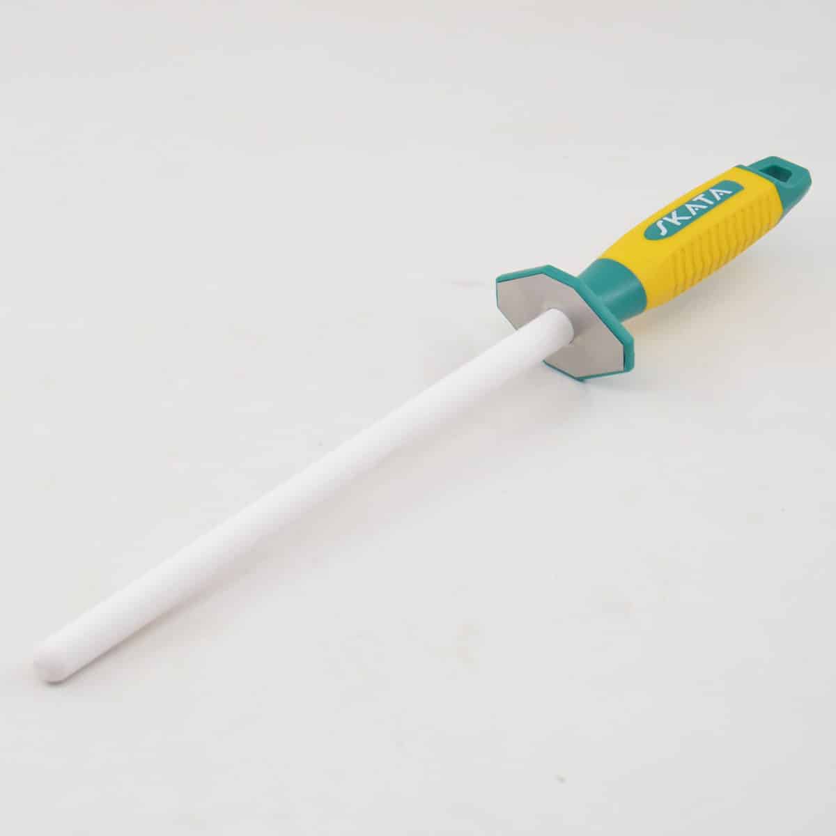 Данный мусат выполнен из высококачественной циркониевой керамики без вкраплений. Ручка изготовлена из пластика с резиновыми вставками, на которых нанесены “насечки”, за счет этого мусат не скользит в руке.