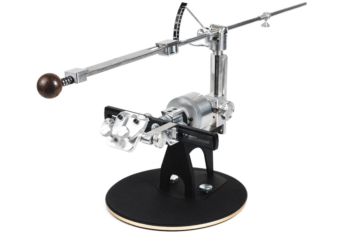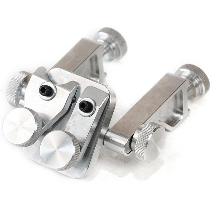 Малый универсальный столик оснащен двумя типами прижимов: укороченной 16мм губкой и Y-образным прижимом, они крепятся к основанию винтами на 3 мм. Для крепления прижимов к основанию предусмотрено три точки крепления, что позволяет затачивать инструмент с самой сложной геометрией лезвия. Прижимы используются как совместно, так и по одному. Основание столика - цельнофрезерованное, и не имеет никаких сварных швов или крепежей. Основание крепится к двум рамочным держателям с помощью винтов-барашков и прижимного цилиндра. Удобные широкие барашки позволяют крепко фиксировать положение столика. Универсальность столика дополняется тем, что основание можно перевернуть в держателях, существенно расширив диапазон применения данного зажима.