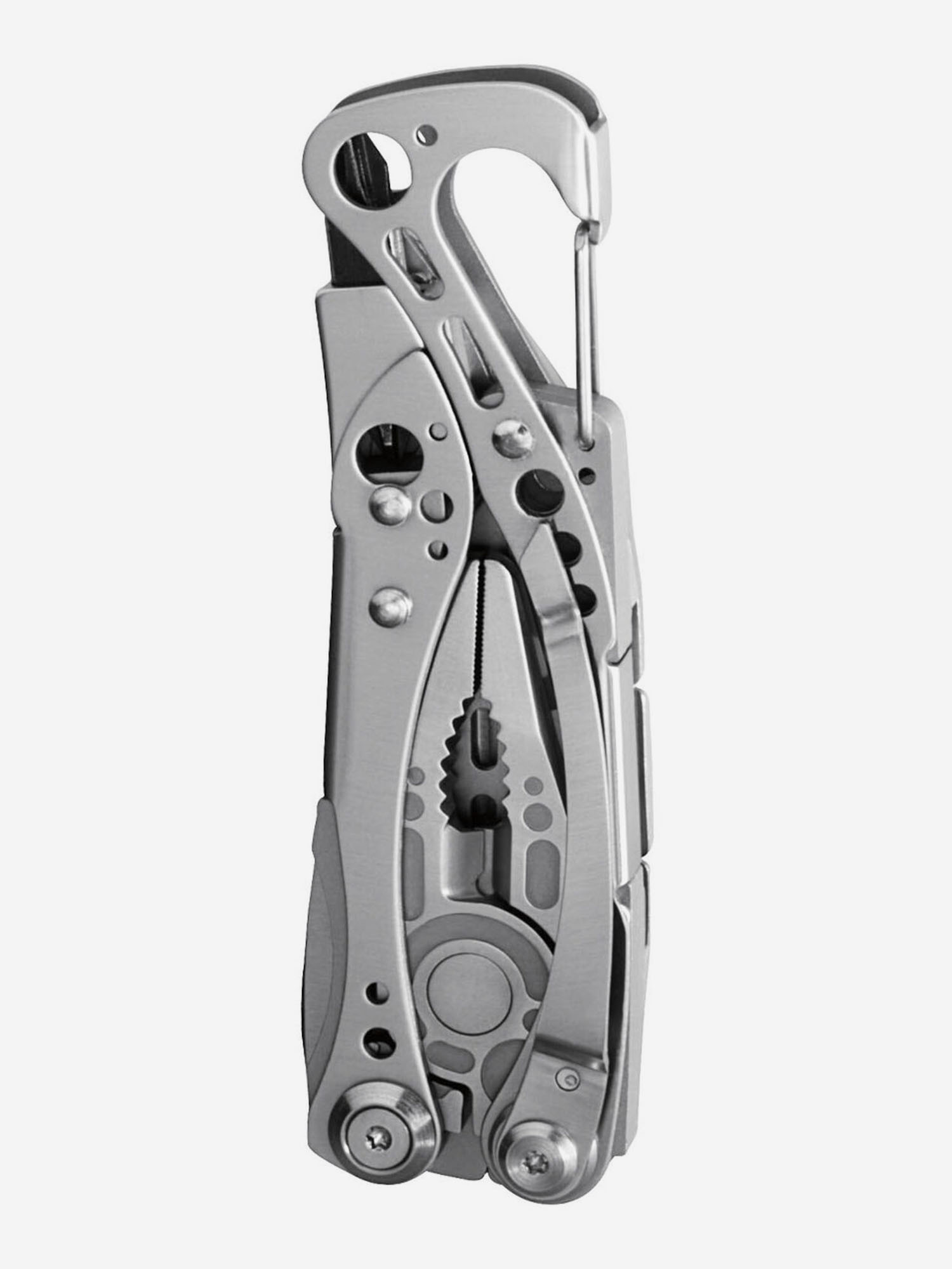 Ручки и корпус предмета производители выполнили из нержавеющей стали. Пользователям понравятся кусачки для твердой проволоки, готовые перекусить даже гвозди, держатель для бит и карабин. Все острые лезвия надежно закреплены предохранителем, который не позволяет им сработать в открытом виде. Главный клинок отлит из стали 420HC, имеет универсальную заточку, где одна часть прямая, а вторая получила серрейторную кромку лезвия. Предусмотрена возможность открытия ножа в Лезерман Скелетул одним движением руки.