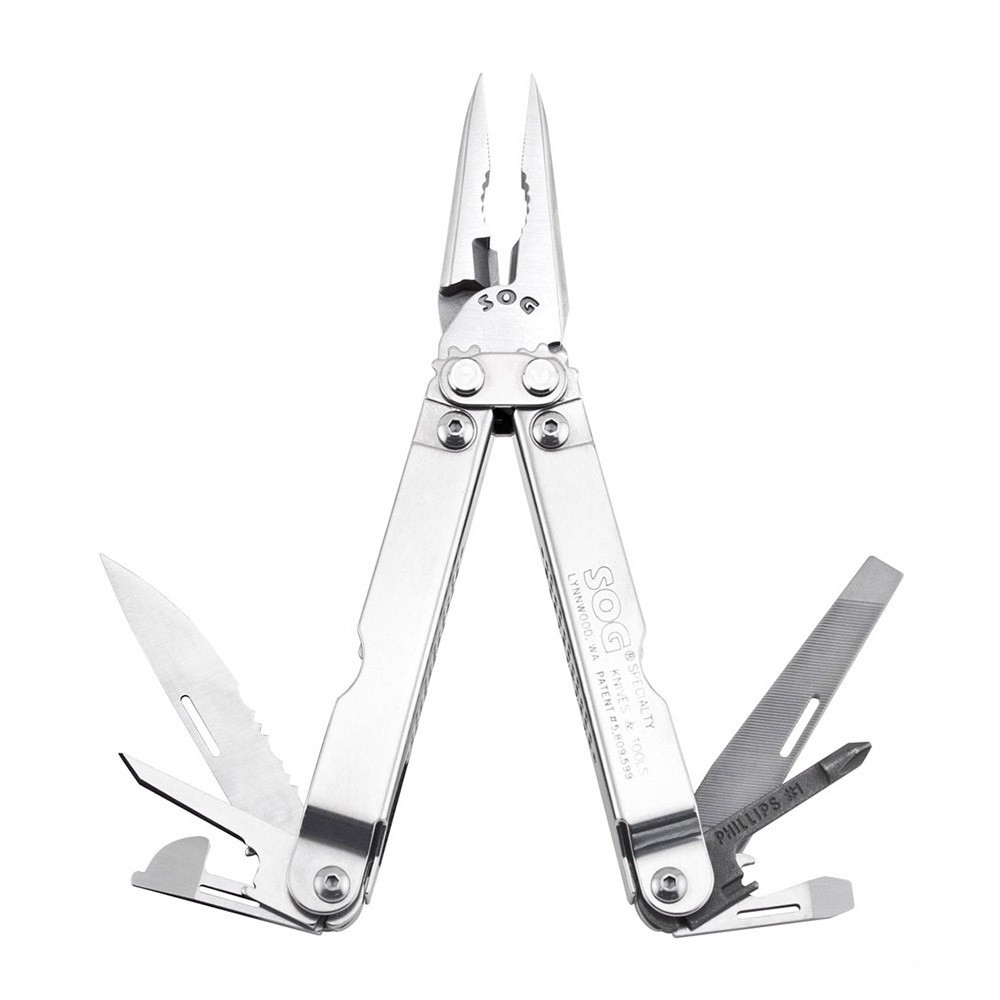 Мультитул Sog SG-S44 Pocket Power Plier - легче, тоньше и с более узкой головкой плоскогубцев. Инструменты: плоскогубцы; кусачки; приспособление для зачистки проводов; полусеррейторное лезвие; напильник 3-х сторонний; отвертка крестовая; шило; консервный нож; малая плоская отвертка; большая плоская отвертка; открывалка; линейка. Лезвие ножа: нержавеющая сталь