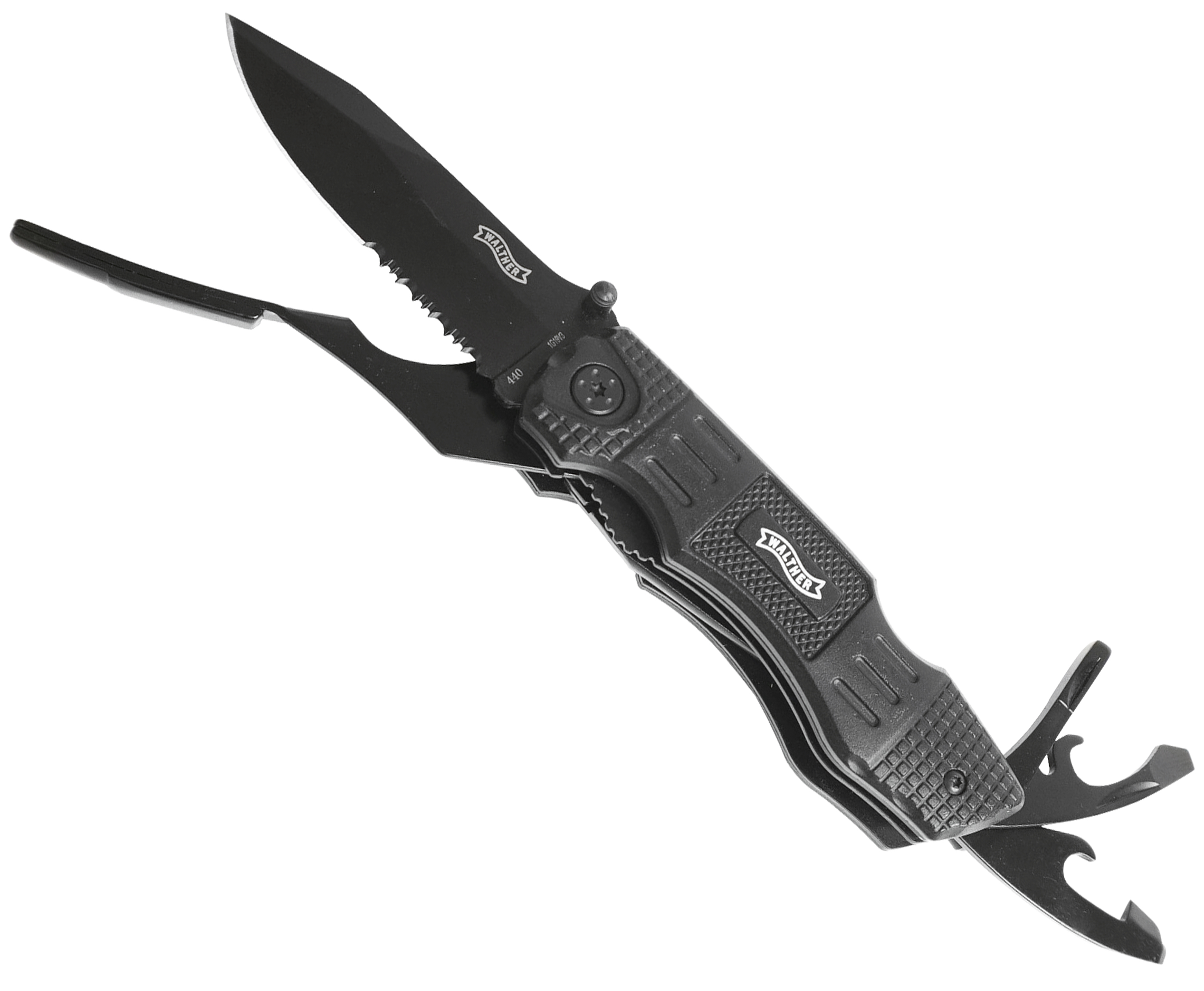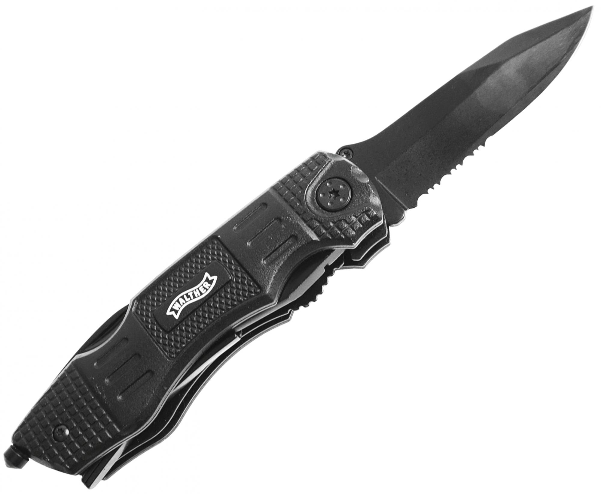 Новинкой среди приспособлений этого вида стало изделие бренда Walther, комплектующееся такими инструментами как консервный нож, плоскогубцы, открывалка для бутылок, а также специальный штифт для установки магнитного поворотного держателя под всевозможные насадки, идущие в комплекте. Главным рабочим устройством выступает клинок с комбинированным лезвием, переходящим от гладкой режущей части к серрейтору, применяемому для перерезания канатов и шнуров, а также прочих пилящих действий.