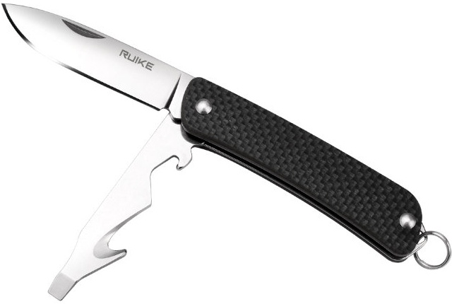 Рядом с клинком ножа в рукоятке размещается еще одна стальная пластина. В ней объединены сразу несколько дополнительных инструментов, которыми производители оснастили модель Ruike S21. На внешнем краю этой пластины сделана прямая отвертка, ширина шлица которой составляет 4 мм. Около нее размещен стропорез, а еще ближе к рукоятке – открывалка для бутылок.