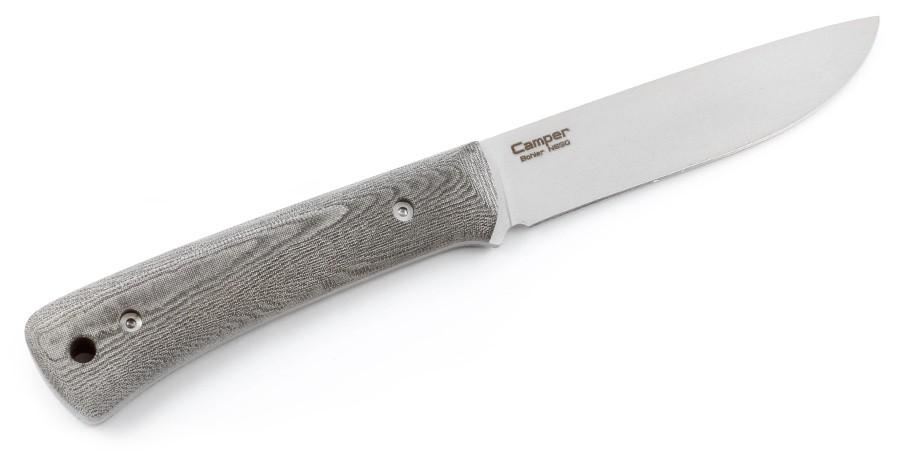 Наиболее распространённая и универсальная для всех типов работ форма клинка drop point присуща ножу Camper. Прямые и высокие спуски от обуха задают правильную геометрию, что положительно сказывается на качестве реза, а наличие дульки облегчает процесс заточки и правки. Сразу за дулькой следует небольшой, но вполне эффективный упор, предотвращающий соскальзывание ладони на лезвие. Левая грань клинка украшена логотипом, а справой стороны размещено название ножа и указана марка стали. Поверхность лезвия матово-серая, такой эффект достигается при пескоструйной или дробеструйной обработке, уплотняющей верхний слой металла. Этот финиш отлично сочетается со схожими тонами рукояти.