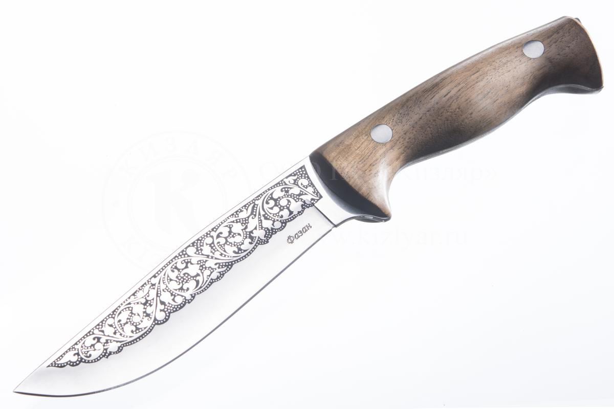 Кизлярский нож "Фазан" 012101. Клинок - Художественно оформленный с глубоким травлением, Рукоять - Дерево. Нож станет верным помощником на кухне загородного дома. Геометрия ножа рассчитана на работу по мясу, овощам, зелени. На исходе лета, когда собирают урожай и заготавливают соленья, работать таким ножом будет не только удобно, но и приятно. А когда гости собираются за столом, нож выполнит функцию разделочного ножа для горячих блюд. Нож пригодится в качестве шеф-поварского ножа на пикнике или в несложном туристическом походе. Для хранения и транспортировки используются кожаные ножны ручной работы.