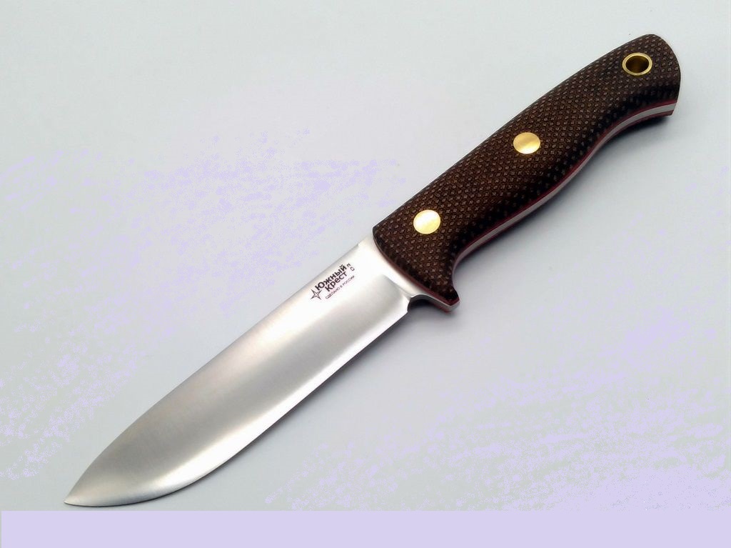 Micarta - отличный материал для рукояти ножа. Изготавливается из слоев ткани и бумаги, пропитанной синтетическими смолами. Материал часто используется в электротехнике. Легко обрабатывается и полируется. При этом микарта остается прочным материалом, не скользит в руке, имеет хорошую теплопроводность. Совершенно не впитывает влагу и стоек к агрессивным средам. Для того, чтобы рука не соскальзывала при работе, на накладки нанесена оружейная насечка. Как показывает практика, при такой обработке накладок рука не скользит даже в дождь и при попадании грязи.