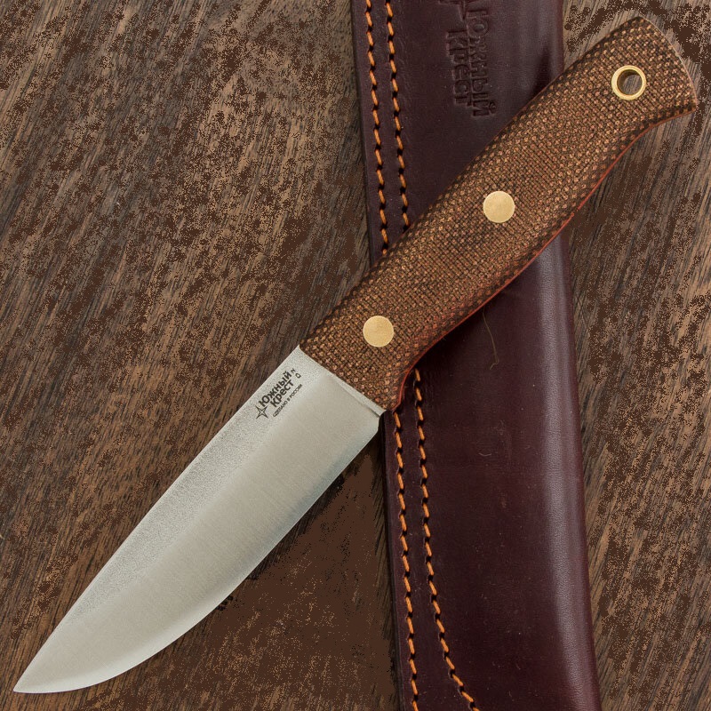 Рукоять выполнена из микарты — это конструкционный композитный материал, представляющий собой слоистый пластик на основе ткани и полимерного связующего вещества. Он прочный, не впитывает ни воду, ни запахи, тактильный и высоко декоративный. Кроме того, текстолит хорошо переносит значительные перепады температуры.