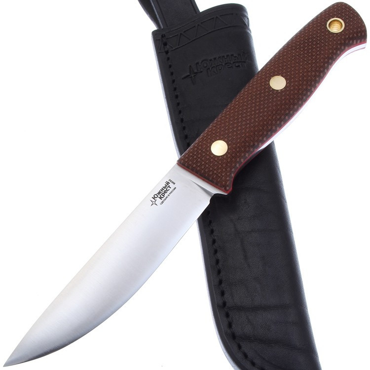 Рукоять выполнена из микарты — это конструкционный композитный материал, представляющий собой слоистый пластик на основе ткани и полимерного связующего вещества. Он прочный, не впитывает ни воду, ни запахи, тактильный и высоко декоративный. Кроме того, текстолит хорошо переносит значительные перепады температуры. Нож комплектуется ножнами из натуральной кожи скандинавского типа, которые имеют два варианта подвеса: свободный при помощи подвесной петли и жестко закрепленный на поясе.