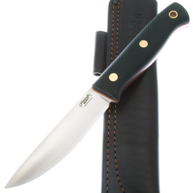 Рукоять выполнена из микарты — это конструкционный композитный материал, представляющий собой слоистый пластик на основе ткани и полимерного связующего вещества. Он прочный, не впитывает ни воду, ни запахи, тактильный и высоко декоративный. Кроме того, текстолит хорошо переносит значительные перепады температуры. Нож комплектуется ножнами из натуральной кожи скандинавского типа, которые имеют два варианта подвеса: свободный при помощи подвесной петли и жестко закрепленный на поясе.