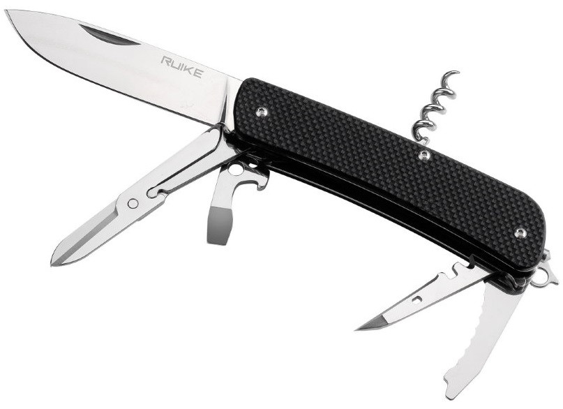 Со стороны рукояти помимо ножа можно достать миниатюрные ножницы. Там же располагается функциональный инструмент, который может использоваться как открывалка для бутылок, прямая отвертка шириной 6,5 мм или инструмент двух видов для зачистки разных проводов от изоляции. С обратной стороны рукоятки имеется вынимаемое шило-развертка, заточенное с одной стороны с отверстием для нити. Этот же инструмент может использоваться в качестве маленького гаечного ключа. Для перерезания строп имеется отдельный инструмент, на конце которого располагается прямая узкая в 3 мм отвертка. В торцевой части ручки встроен стеклобой и маленькое стальное кольца для темляка. Здесь же размещены щипцы, которые можно использоваться как самостоятельный инструмент. На спинке рукояти имеется штопор. Материалом для накладок рукоятки служит современный стеклопластик высокой прочности G10.