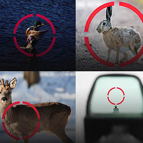 В этом прицеле реализованы решения, защищённые тремя мировыми патентами: уникальный точечный замер освещённости, крепление к планке, поглощающее отдачу, и сам красный круг. Круг обеспечивает отличное прицеливание, показывая стрелку, когда точность попадания гарантирована, диаметр круга показывает диаметр дробового снопа на расстоянии 20 метров.