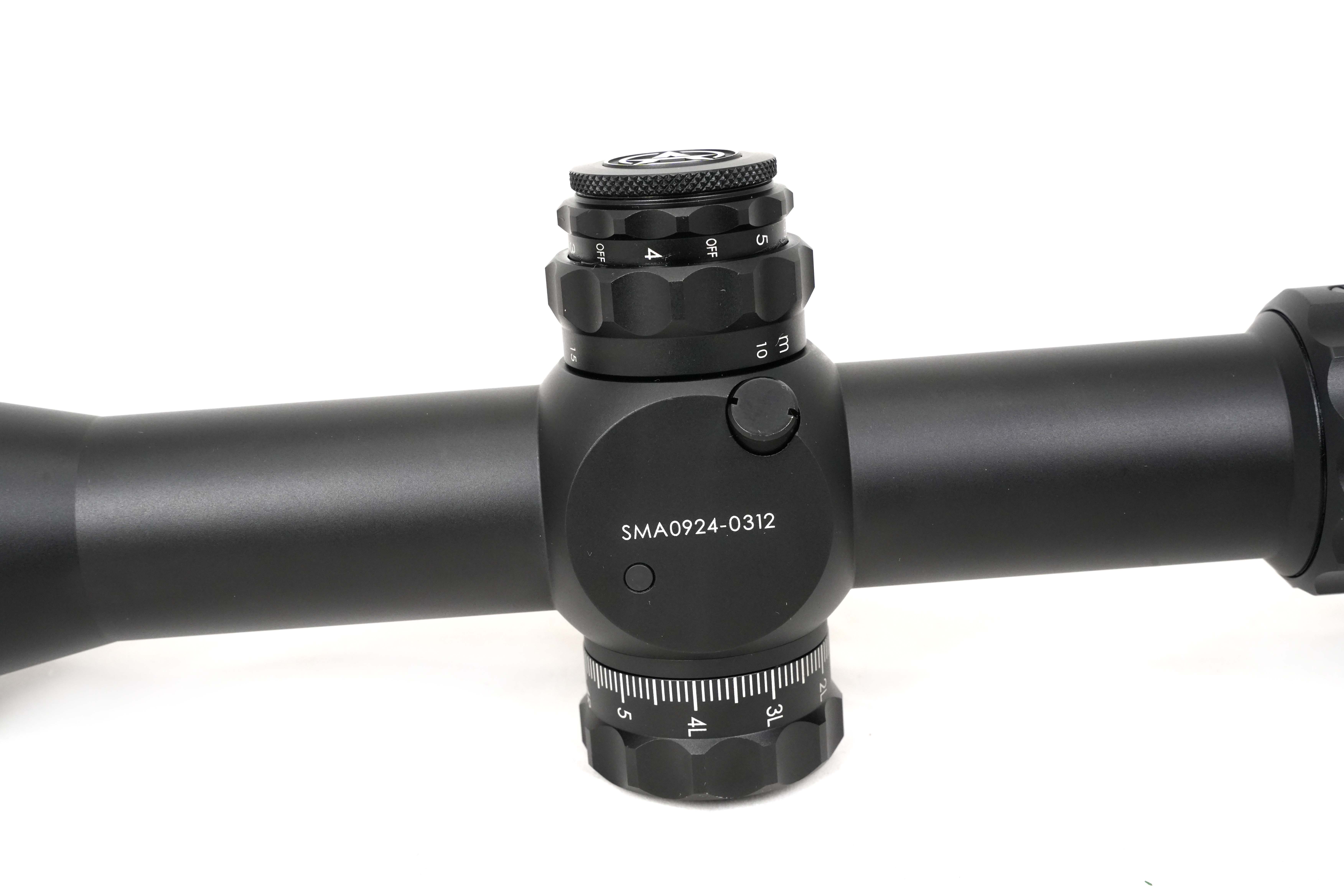 Баллистическая прицельная сетка расположена в первой фокальной плоскости (FFP), что обеспечивает постоянные угловые размеры между элементами при любом увеличении. Это позволяет вести огонь выносом, определять дистанцию до цели по ее габаритам и оценивать скорость движения. Сетка нанесена на линзу методом лазерной гравировки. Многоуровневая подсветка гарантирует отличную видимость на мишени при любом уровне внешнего освещения. Параллакс настраивается с помощью бокового барабана.