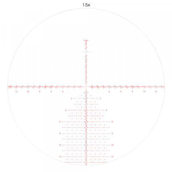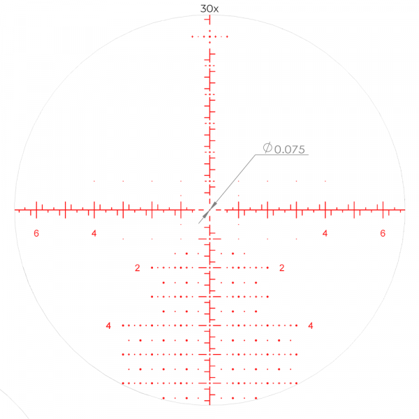 - Прицельная сетка AM530. Прицельная сетка AM530 расположена в первой фокальной плоскости (FFP) и изменяет свой масштаб согласно установленной кратности. T — образное перекрестие не препятствует обзору и позволяет быстро захватить цель на минимальной кратности 5х. Выставив увеличение в диапазоне от 15х до 30х, стрелок получает возможность оперативно вносить поправки с помощью информативной разметке по горизонтали и вертикальной «елочки». Наличие сразу 11 уровней подсветки исключает трудности адаптации к различным условиям освещения и сложному фону локации. Промежуточные «нулевые» положения барабана позволяют одним движение отключить подсветку и моментально вернуться к предыдущему уровню яркости.