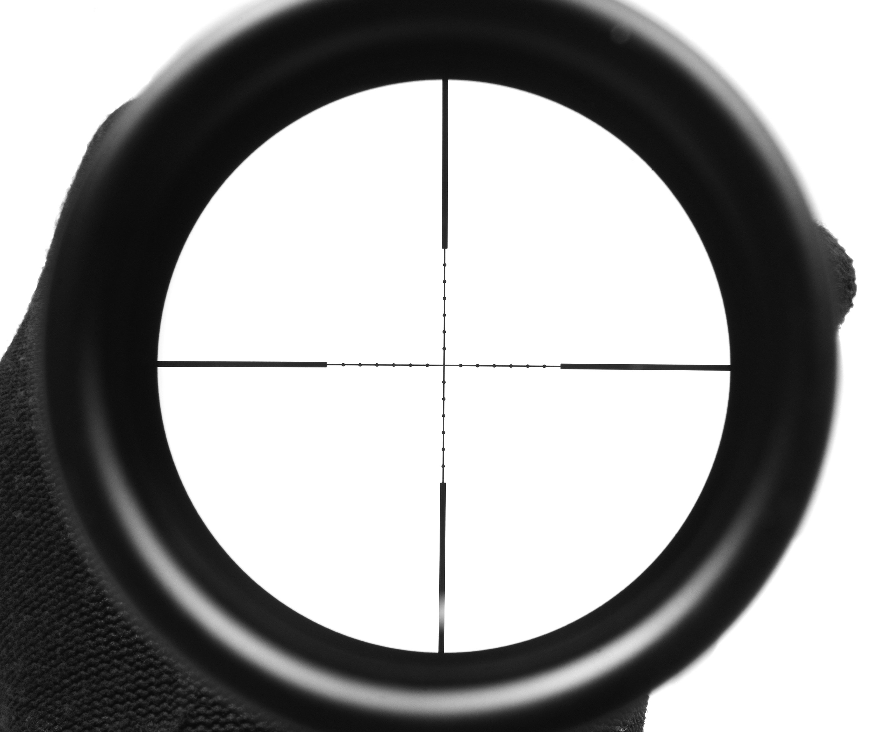 Для наведения на мишень используется популярная сетка Mil-Dot с баллистическими пометками, которые не мешают обзору. Перекрестие расположено во второй фокальной плоскости SFP. Механизм юстировки представлен двумя барабанчиками в центральном узле корпуса - после снятия колпачков вертикальные и горизонтальные поправки вносятся с шагом 0.25 MOA с каждым кликом вращения турелей.