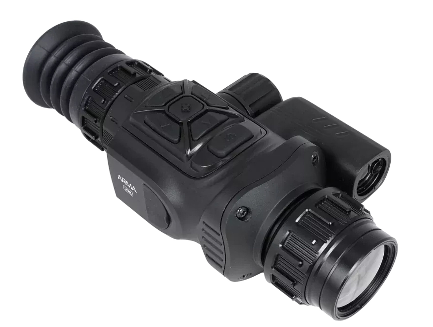Прицел оснащен германиевым объективом с фокусным расстоянием 35 мм и апертурой F1.0. Настройка резкости на необходимую дистанцию выполняется с помощью низкопрофильного кольца на объективе. Начальный уровень увеличения составляет 3,1х. Для увеличения изображения доступна функция Digital zoom, позволяющая плавно или дискретно изменять кратность от 1х до 8х, достигая максимального значения 24,8х. При минимальном увеличении угол поля зрения (FOV) составляет 7,5° х 5,7°, что соответствует видимой области пространства размером 13,1 на 10 метров на удалении 100 метров.