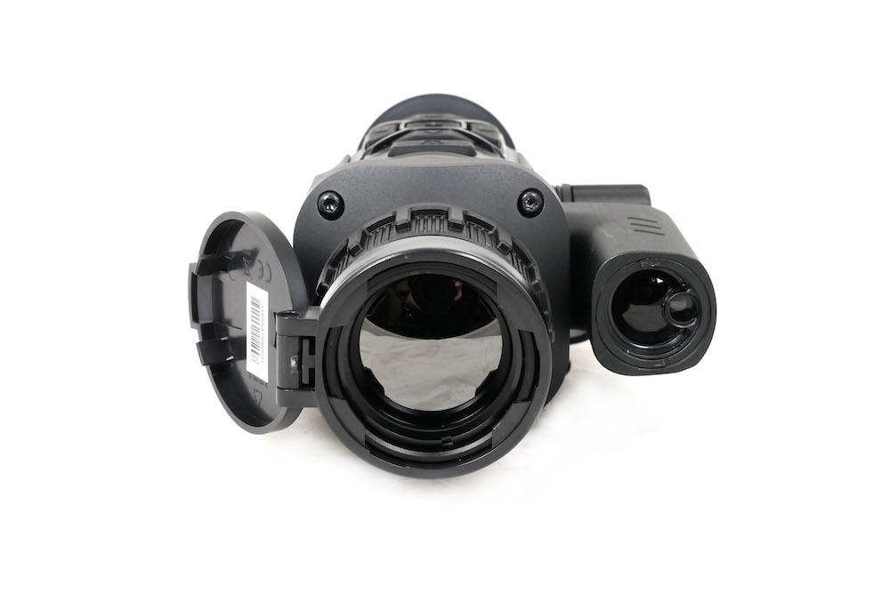 Тепловизионный прицел оснащен лазерным дальномером, способным оперативно измерять расстояния в диапазоне от 10 до 1200 метров. Излучатель и приемник находятся в одном оптическом канале, а само устройство удачно вписано в общий концепт конструкции и не мешает обзору. Дальномер работает на длинах волн 905 нм и отвечает требованиям первого класса лазерной безопасности. Погрешность измерений составляет ±1 м. Доступно 2 режима работы: одиночное измерение и режим непрерывного сканирования.